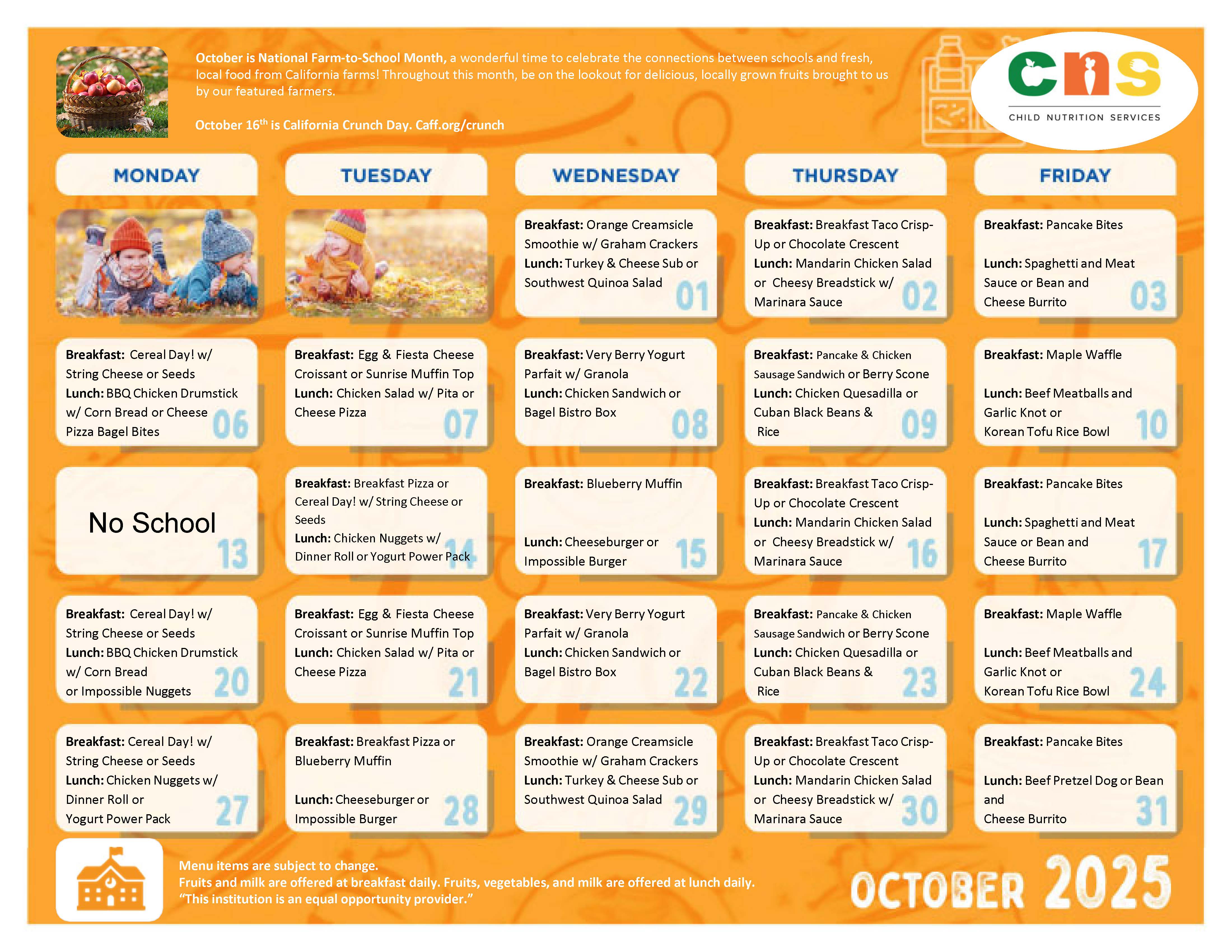 Del Mar Union School District participates in the School Breakfast Program (SBP) and National School Lunch Program (NSLP). This program provides students with nutritious meals that comply with the Healthy Hunger-Free Kids Act of 2010. The SBP and NSLP enhance students’ learning abilities by contributing to their physical and mental well-being. Studies show that children whose nutritional needs are met have fewer attendance and disciplinary problems and are more attentive in class.